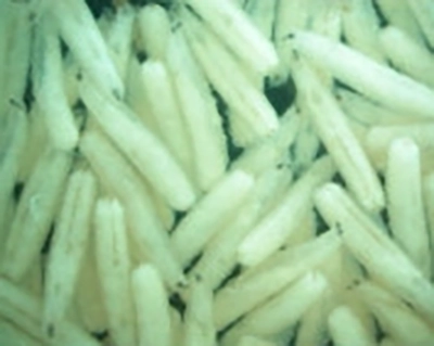 Mide 1 mm x 0.2 mm, tiene color blanco, forma alargada y cónica, con micrópilo corto.
