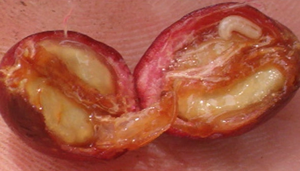 Del huevo nace la larva o gusano que al alimentarse excava y daña la fruta produciendo pudriciones secundarias asociadas a microorganismos.