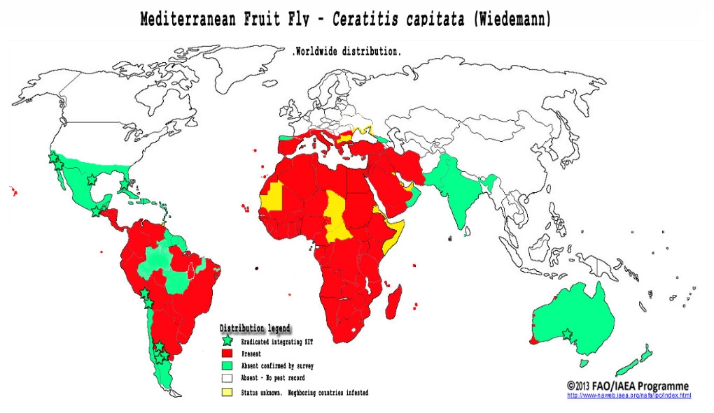 La mosca del Mediterráneo Ceratitis capitata (Wiedemann), también conocida como mosca de la fruta, es una de las plagas agrícolas más destructivas de frutas y hortalizas del mundo con capacidad para infestar plantaciones frutales enteras, por lo que se le considera una de las especies de moscas de mayor importancia económica.