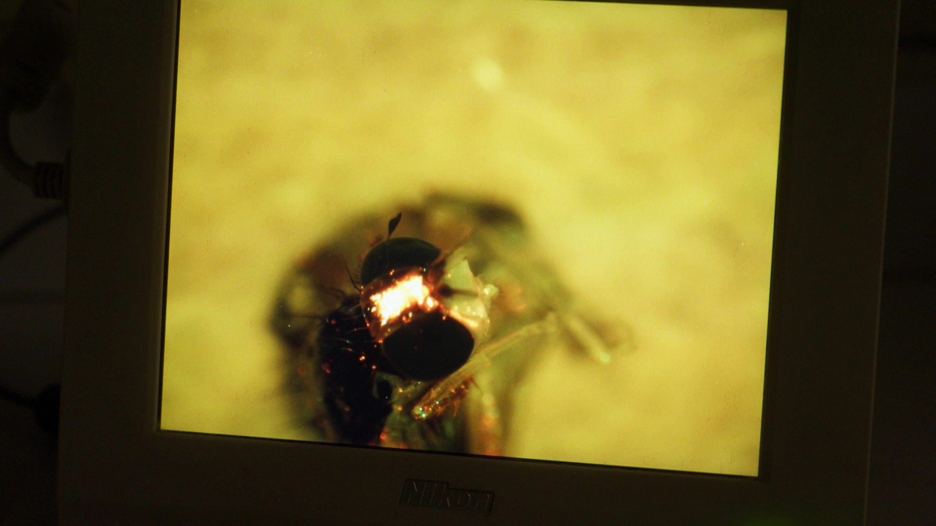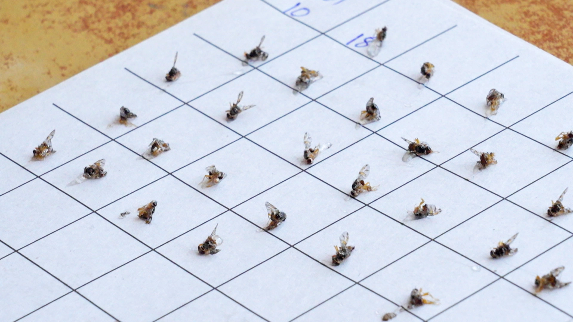 Cada mosca es colocada en hojas cuadriculadas, con la cabeza hacia arriba, utilizando una aguja de disección entomológica.